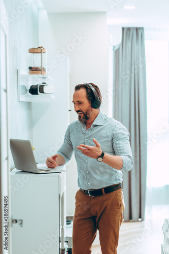 profession, joy, positive, adult, chat, device, photogenic, indoor, home, male, attractive, enthusiastic, conference, alone, distant, productive, video, contraption, meeting, technology, happy, flat, wireless, employee, smile, computer, tech, modern, cheerful, show, smiling, earphones, contented, demonstrate, laptop, smart, clever, sound, eloquent, man, caucasian, glad, waist up, online, job, work, portable, specialist