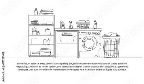 vector, illustration, outline, concept, advertising, banner, print, line, design, continuous, drawing, doodle, graphic, linear, vignetting, 1, hand, art, symbol, business, icon, isolated, contour, single, black, laundry, home, setup, clothes, modern, fabric, interior, cleaning, washing, detergent, room, equipment, hanger, washing machine, basket, iron, spray, plant, stack, short, t-shirt, cupboard, clothes line, bottle
