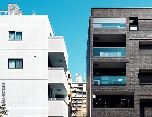 architecture, building, modern, contemporary, design, contrast, white, black, grey, brick, tile, balcony, window, glasses, facades, structure, urban, city, skyscraper, residential, housing, exterior, elevation, line, geometric, pattern, texture, sunlight, shadow, daytime, blue, sky, minimalist, style, aesthetic, urbanism, development, property, city landscape