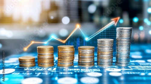 Conversion Rate Growth Chart, a digital bar graph with an increasing upward arrow indicating growth. stacks of coins symbolizing cost efficiency. financial success.