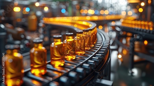 Conveyor belt in a modern factory producing glass bottles filled with amber liquid, showcasing efficient industrial automation and manufacturing processes.