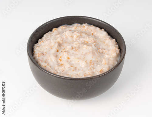 Cooked spelt in bowl. Oatmeal milk porridge, boiled emmer or spelt, healthy cereal food