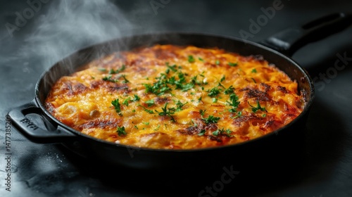 cooked tasty dish on the pan, wiith a fog, black background, top view