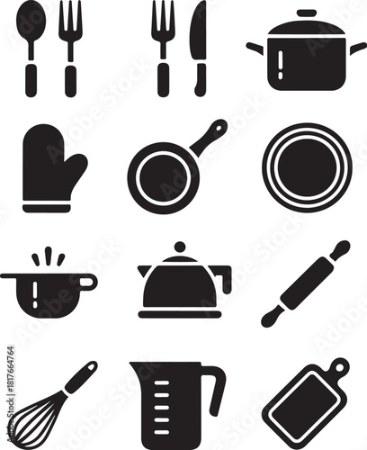 cooking, kitchen, utensil, food, preparation, culinary, equipment, tool, symbol, icon, silhouette, cookware, tableware, utensil, spoon, fork, knife, pot, pan, plate, glove, cup, kettle, rolling, pin, whipped, measuring, jug, board, chopping, cook, bake, eat, dinner, lunch, breakfast, design, element, graphic, set, collection, outline, vector, simple, black