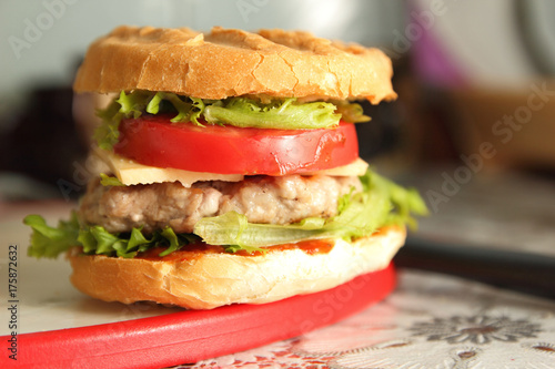 Cooking of burgers with veal, red tomatoes, lettuce, cheese and sauce in the home kitchen