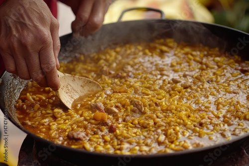 cooking, paella, rice, food, hand, pan, wooden, spoon, stirring, hot, delicious, meal, preparation, dish, flavorful, ingredient, meat, vegetable, sauteed, seafood, eatery, market, street, event, tradition, spanish, cookery, warm, gold, yellow, brown, spicey, alimentary, healthy, tasty, deliciously, cooked, fresh, vibrant, colourful, rustic, homemade, serving, aroma, steam