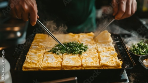 Cooking Tamagoyaki, also known as Tamago traditional Japanese Rolled Omelette, involves a man handling a skillet filled with cooked scrambled eggs and rolling them into a rectangle omelet.