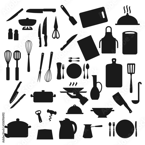 kitchen, cooking, utensil, kitchen utensile, appliance, cookware, cutlery, icon, vector, silhouette, glassware, cook, spoon, fork, knife, household, blender, plate, saucepan, mixer, frying, pan, corkscrew, opener, hatchet, catering, eatery, waiter, grater, dish, washer, ladle, cutting, board, whipped, apron, glove, cup, crockery, bowl, porcelain, domestic, house, food, chef, cookbook, bakery, cookery, baking, spatula