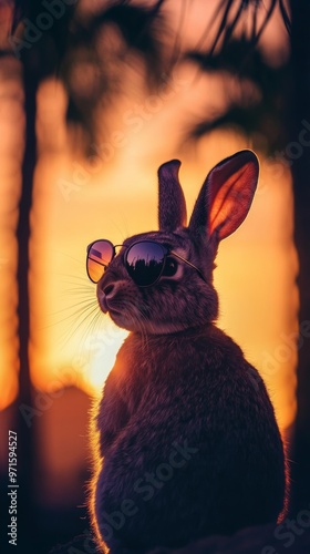 Cool rabbit wearing sunglasses posing during golden hour sunset