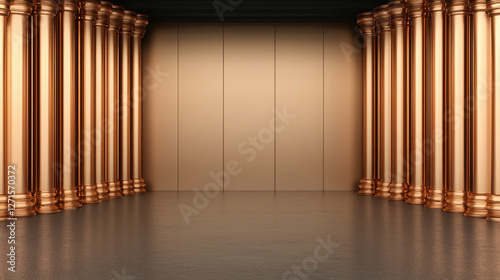 Copper Plumbing Pipes Theme, stunning interior featuring shiny copper columns and reflective floor, creating elegant