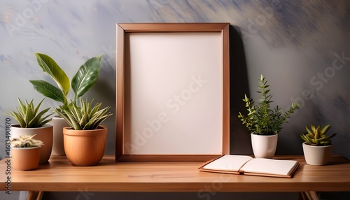 copy space on a wooden frame sits on a table surrounded by potted plants and a closed notebook creating a warm and inviting atmosphere