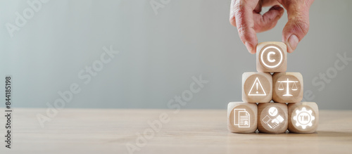 Copyright or patent concept, Hand holding wooden block on desk with copyright icon on virtual screen, Author rights and patented intellectual property, copyleft trademark license.