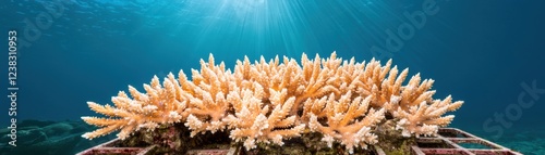 Coral reef restoration underwater nursery concept. Vibrant coral reef thriving underwater with sunlight above