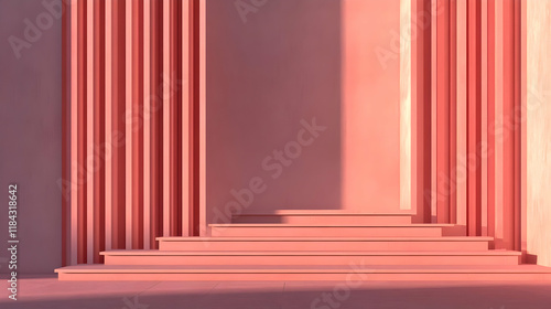 illustration, coral, pink, step, stair, background, abstract, geometric, design, architecture, minimal, modern, interior, texture, pattern, light, shadow, wall, surface, scene, stage, platform, display, product, presentation, vibrant, calm, serene, clean, simple, elegant, stylish, contemporary, space, empty, blank, pastel, colours, hue, shade, tone, soft, smooth, glossy, matte, sun, warm