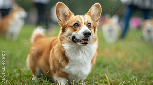Corgi dog inspected at a dog show in a park during a sunny afternoon