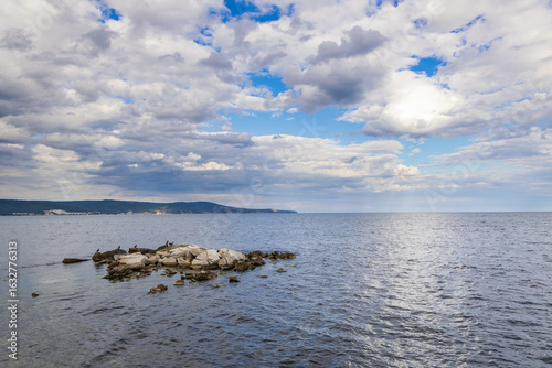 Cormorants seen from Black Sea coast in Old Town of Nesebar historic city in Bulgaria