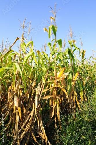 cornfield, field, corn, foliage, summer, landscape, agriculture, agricultural, rural, season, sunlight, sky, blue, stalk, countryside, grass, green, seasonal, cultivated, organic, lowland, plant, maize