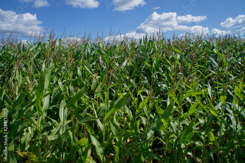 field, corn, agriculture, sky, green, farm, nature, plant, blue, crop, food, maize, summer, landscape, grass, cornfield, rural, farming, harvest, countryside, growing, grow, cornfield, country, growth
