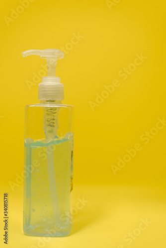 Coronavirus prevention hand sanitizer gel in bottle. Hand disinfectant gel isolated on yellow background.