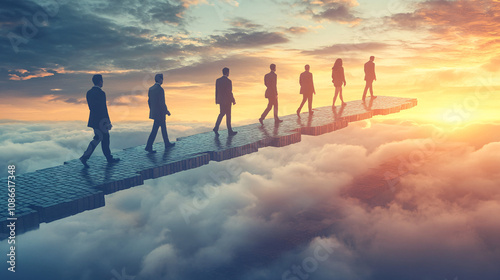 Corporate Leaders Walking Across Floating Tiled Bridges, Symbolizing Leadership, Strategic Thinking, and Career Paths