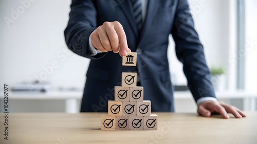 Corporate professional building success pyramid with checkmark blocks, representing business reliability, financial security, compliance strategy, quality assurance, and organizational growth planning