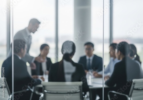Corporate Team Discussion. Professionals engage in a vital meeting, seen through glass. The soft focus emphasizes collective interaction, planning, and confidential decision making.