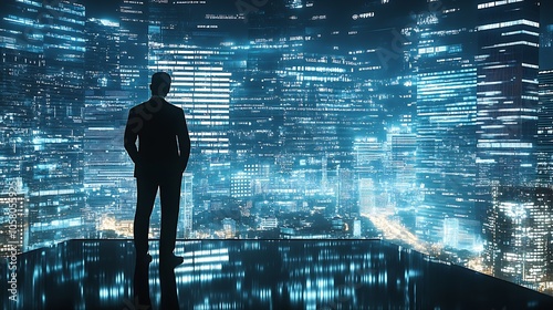 corporate, visionary, digital, night, skyline, technology, future, illuminated, businessman, modern, city lights, perspective, high technology, silhouette, innovation, architecture, metropolitan, professional, executive, skyscraper, downtown, advanced, futuristic, global, network, neon, cybernetic, finance, contemporary, elite, business district, ambitious
