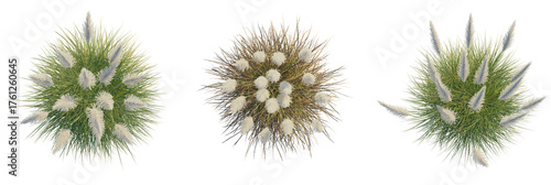 Cortaderia selloana sunningdale silver trees plan, top view, cutout, transparent background, isolate, Three fluffy ornamental grasses with feathery plumes, top view isolated