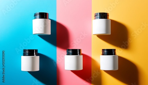 Cosmetic bottles arranged on a colorful background with white containers, perfect for modern beauty product presentations