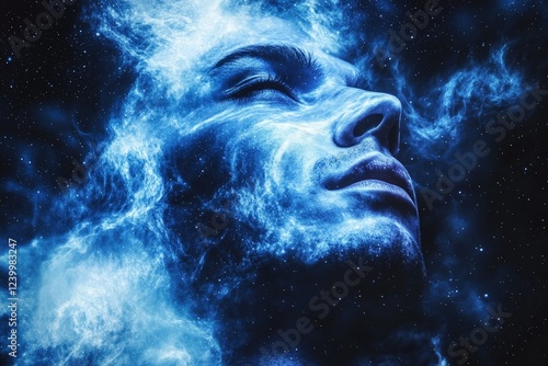 man, nebula, space, cosmos, star, galaxy, celestial, dream, fantasy, surreal, blue, dark, night, mystery, spiritual, energy, meditation, cosmic, divine, calmness, serenity, peace, imagination, abstract, artwork, artistic, digital, art, image, picture, photo, graphic, design, visual, aesthetic, creation, human, head, face, portrait