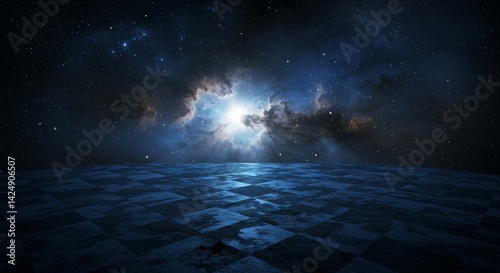 Cosmic Chessboard: A Dark Blue Checkered Floor Under a Starry Ni