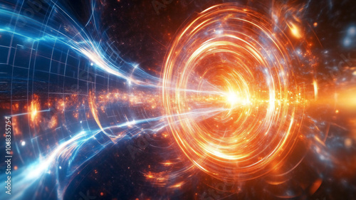 Cosmic Convergence: Abstract energy vortex of fiery orange and icy blue, swirling into a bright core. A captivating visualization of power, transformation, and cosmic energy.