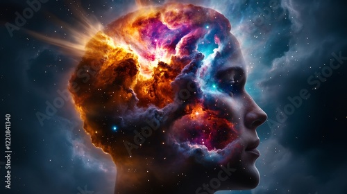 nebula, cosmos, space, universe, star, galaxy, astronomy, mind, head, woman, profile, portrait, imagination, dream, fantasy, mystery, spiritual, consciousness, thought, energy, creation, forever, wonder, cosmic, celestial, divine, abstract, art, digital, surreal, hallucinogen, colours, vibrant, dark, light, fire, glowing, powerful, intriguing