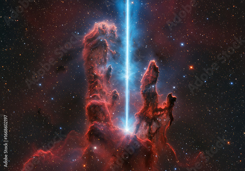 space, cosmos, universe, nebula, dust, gas, light, beam, pillar, structure, formation, celestial, astronomy, science, exploration, galaxy, star, cosmic, aethereal, glowing, bright, colours, red, blue, dark, huge, deep, wonder, awe, majestic, beauty, nature, pattern, texture, detail, abstract, shape, composition, energy, radiation, spectrum, infrared, ultraviolet, observation, telescope, image, visual, phenomena