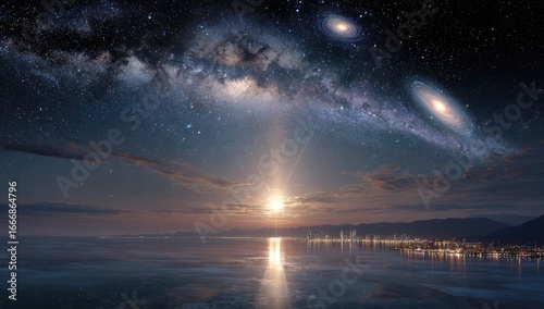 cosmic, sunrise, city, water, milky way, galaxy, star, sunset, night, sky, cloud, landscape, panorama, astronomy, light, dawn, urban, horizon, mountain, atmosphere, beautiful, amazing, space, planet, universe, astral, glowing, vibrant, colourful, exterior, night time, seascape, city landscape, serene, calm, evening, morning, dramatic, high-coloured, intricate, photorealistic, digital, art, image