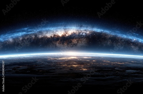 space, earth, galaxy, milky way, universe, cosmos, planet, star, nebula, celestial, sunrise, sunset, atmosphere, cloud, light, glow, horizon, night, day, dark, blue, orange, light, city, landscape, panorama, orbit, view, outer, solar, system, astronomy, science, digital, graphic, illustration, artistic, beautiful, amazing, stunning, fantasy, imagination, exploration, spacecraft, glowing, cosmic, huge