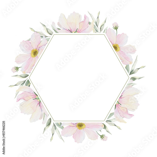 Cosmos flowers and leaves. Isolated hand drawn watercolor frame of pink cosmea. Summer floral of pink wildflowers wreath for wedding invitations, cards, packaging of goods