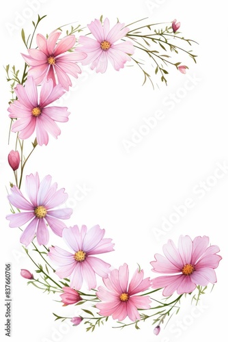 cosmos themed frame or border for photos and text. with delicate pink and white flowers. watercolor illustration, white color background.
