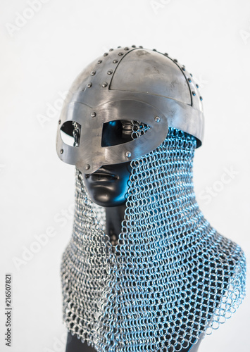 Costume, Viking helmet with chain mail in a black mannequin on white background. clothes for the viking war