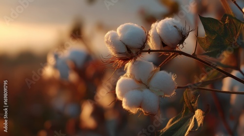 Cotton boll glowing in golden hour sun. Agriculture field harvest background. Natural fiber plant for textile industry.