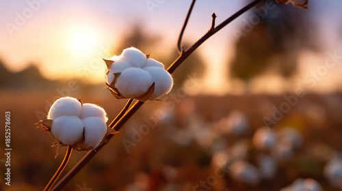 Cotton bolls growing on a branch in a field illuminated by warm sunlight.
