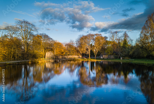 landscape, water, lake, symmetric, cloudy, sky, nature, tree, autumn, background, beautiful, travel, view, colours, cloud, beauty, natural, light, evening, sun, bright, colours, calm, countryside, latvia, yellow, rural, blue