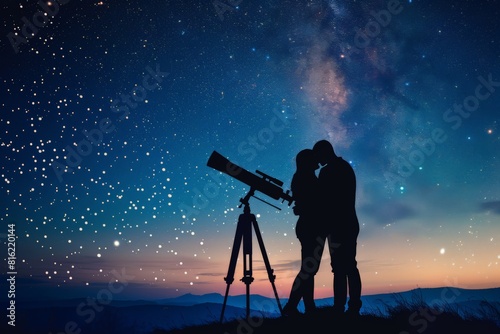 Couple embracing by telescope under starry night. Stargazing and observation concept. Adventure and discovery. Design for poster, wallpaper. Outdoor astronomy hobby