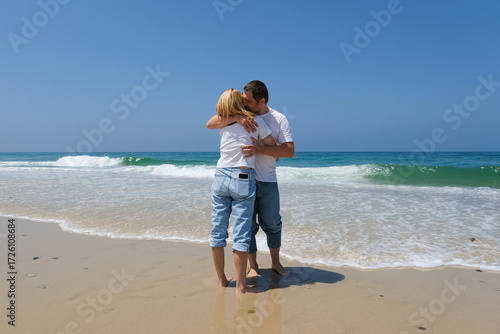 couple, beach, hug, sea, love, ocean, barefoot beach, hugs, romance, human relationships, affection, summer, jean, white, casual attire, water, wave, sand, intimacy, bonding, happiness, togetherness, freedom, nature, sky, travel, tenderness, peaceful, blue, oneness, connection, lifestyle, emotional, natural, cheerful, joy, vacation, serene, holiday, caring, scenery, simplicity, romantic, shore, harmony, day, fun, relaxation