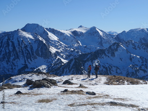 Couple en Raquette en montagne sur la neige en alpinisme dans les Pyrénées
