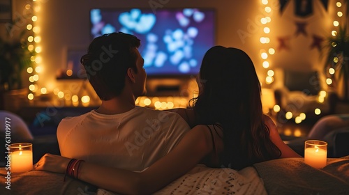 Couple enjoying a movie night at home with ambient candlelight and cozy atmosphere.