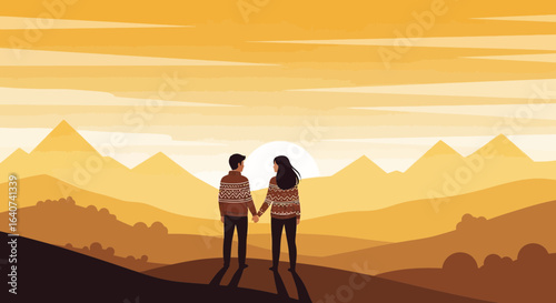 couple, sunset, mountain, romance, love, journey, adventure, nature, together, gold, scenic, vista, landscape, peaceful, calmness, connection, sweater, casual attire, dusk, outdoors, happiness, harmony, human relationships, serenity, wanderlust, escape, get-away, destination, leisure, relaxation, exploration, hillside, sky, sunlight, shadow, illustration, cartoon, vector, graphic, design, background, calmness, silence