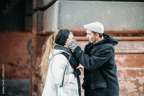 Couple has fun and laughs. kiss. Young hipster couple hugging each other in winter park. Winter love story, a beautiful stylish young couple. Winter fashion concept with boyfriend and girlfriend.