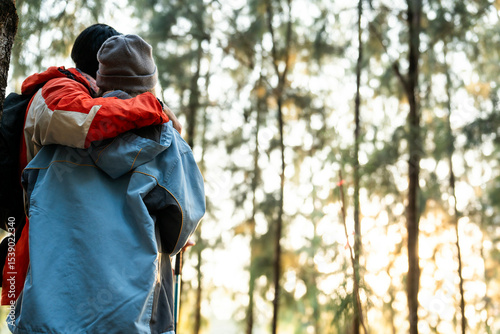 couple, hiking, forest, nature, sunset, golden hour, hugs, romance, adventure, outdoors, love, warm clothes, foulard, beanie, travel, bonding, exploration, human relationships, happiness, sunlight, flare, natural light, peaceful, scenic, trail, trekking, journey, romantic, connection, lifestyle, autumn, emotional, supportive, smile, caring, partnership, affection, holding hands, winter clothes, together, freedom, wanderlust, standing, tree, perspective
