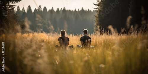 couple practicing yoga in clearing Harmony, meditation, healthy lifestyle, relaxation, yoga, self care, mindfulness concept